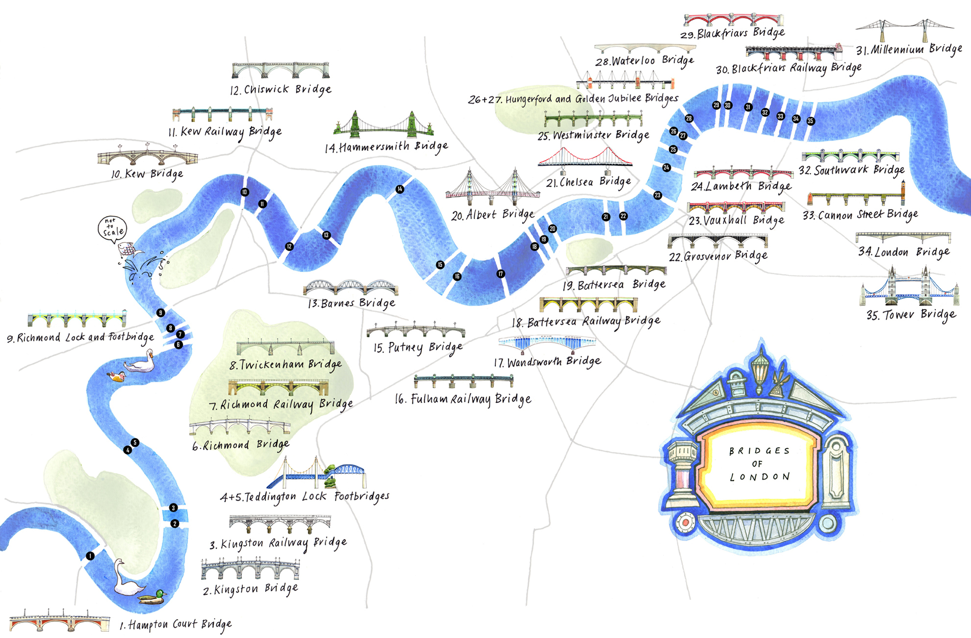 36 Bridges of London from Hampton Court in the west to Dartford in the east.