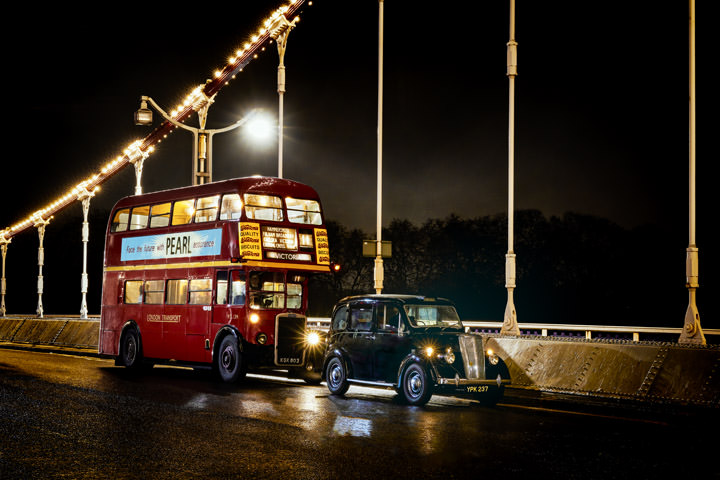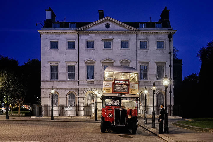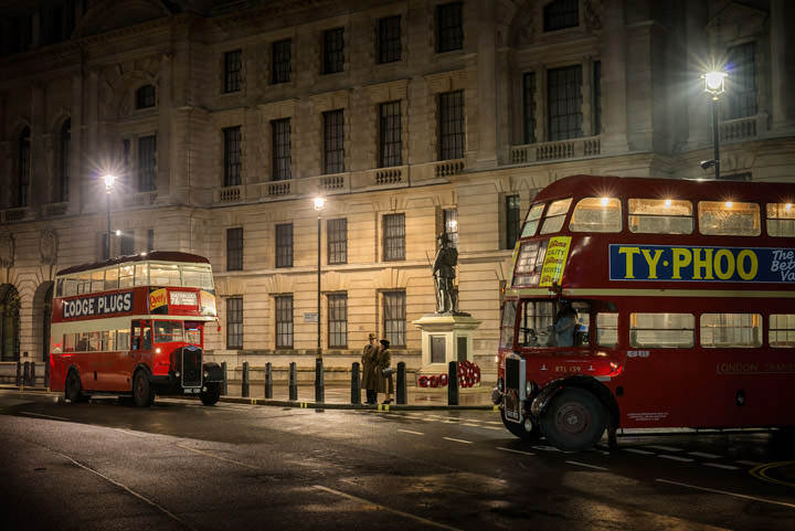 These photographs are the result of more than a dozen nights like this in London. All the scenes were staged. There are just too many people and traffic in the city to create great transport images without planning. All feature vintage buses, beautiful vehicles especially when compared with modern day transport. Period reenactors add authenticity to some of the scenes.