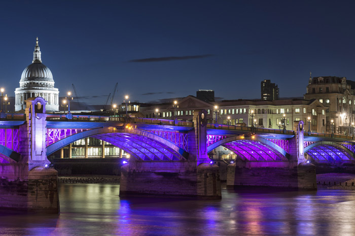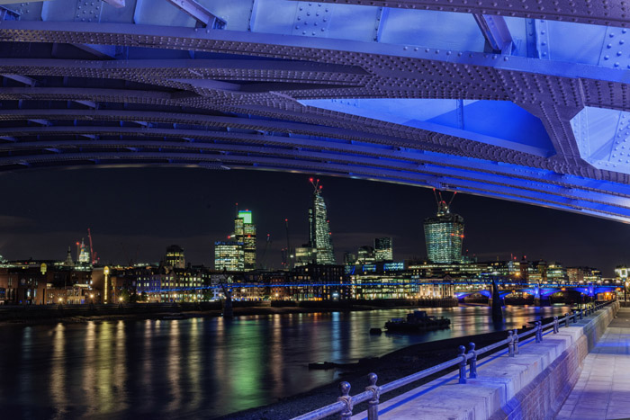 This photograph is a personal favourite. It shows the City of London skyline beneath spectacular lighting of Blackfriars Bridge. I like the way the detail of the bridge frames the new London skyscrapers in the background.
