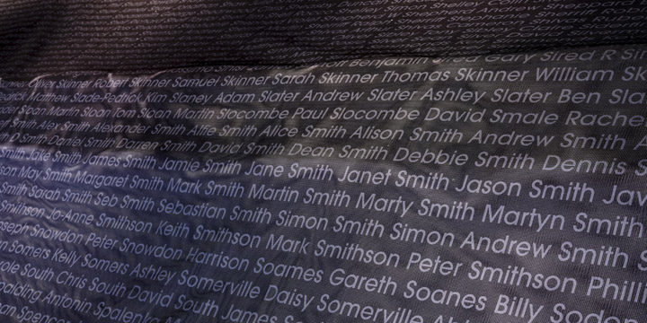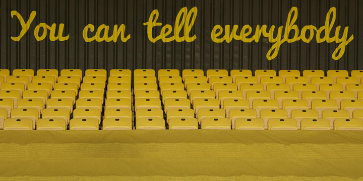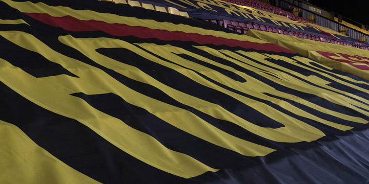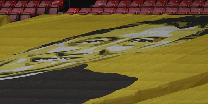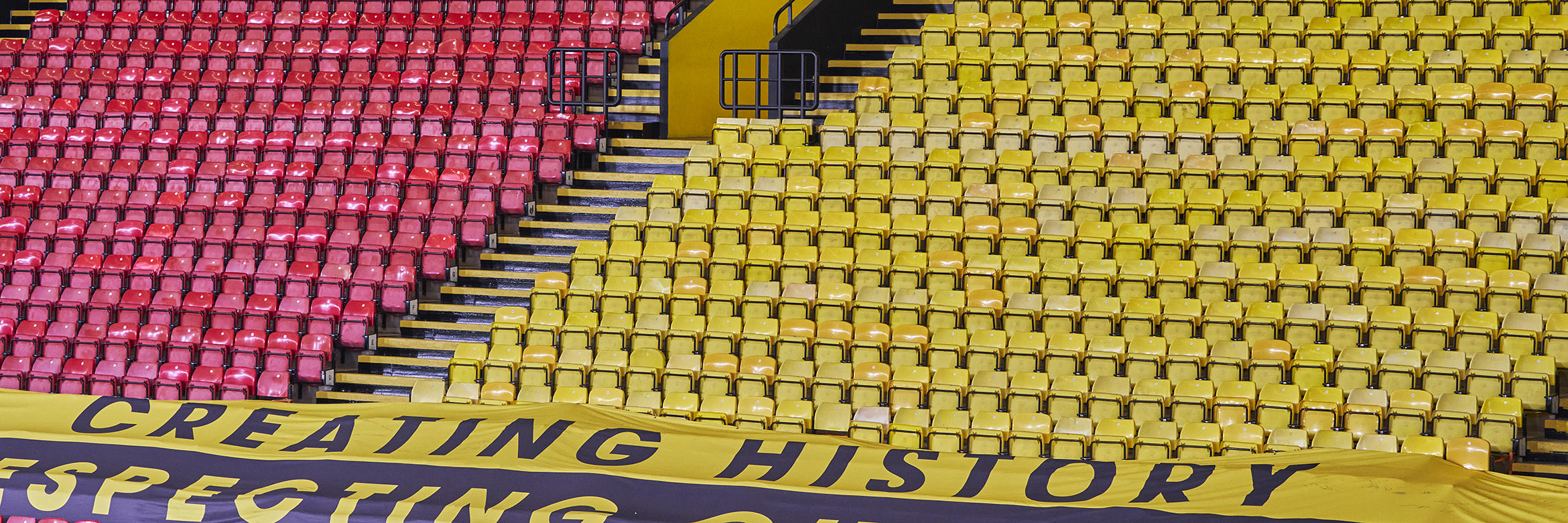 Decorations take the place of supporters. Slogans and pictures in club colours of yellow, red and black adorn the stands. There are scarves on some seats. Across others a tapestry contains the names of every season ticket holder.