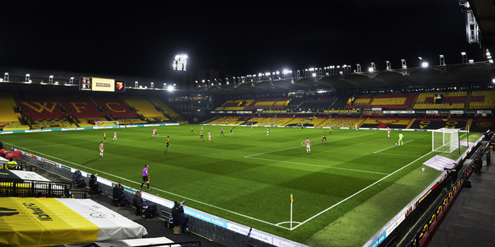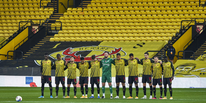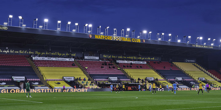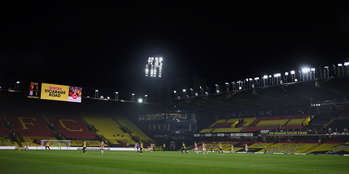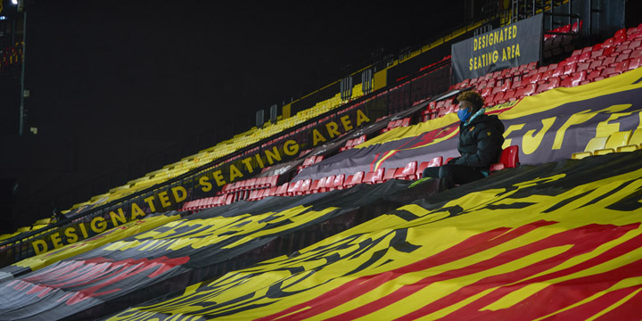 After COVID registration, permitted visitors enter an almost empty stadium. As kick off approaches no atmosphere builds. Watford FC, the home club do their best to uphold traditions. The golden boys come out to the "Z Cars" theme. Players are announced over the tannoy system. But the pre kick off rituals have fallen victim to COVID protocols. The teams enter the pitch separately, there is no ceremonial shaking of hands before the game gets under way.