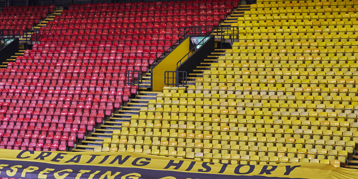 I was commissioned by Watford FC to create imagery that told the story of the pandemic in football. I combined this pair of images: a rocking Vicarage Road after a historic win against Liverpool, and the Stoke City game without fans.