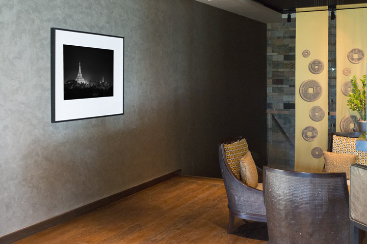 Fairmont the Palm is a luxury hotel on the Palm, a man made island in Dubai. They chose a portfolio of spiritual images for their Ba restaurant. Shown here is a black and white framed print of the Shwedagon Pagoda in Yangon, Myanmar.