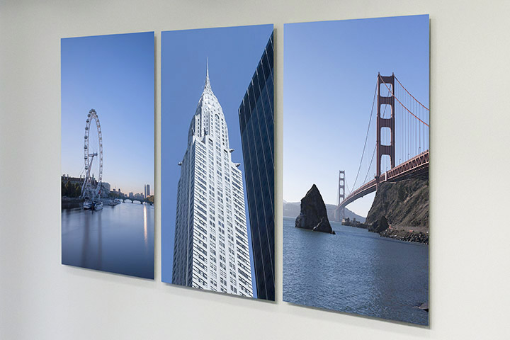 This bespoke triptych features London, New York and San Francisco, cities where the Insurance broker Integro is represented. Alongside this piece, chosen for the company boardroom, we supplied pictures of London scenes for offices and meeting rooms.
