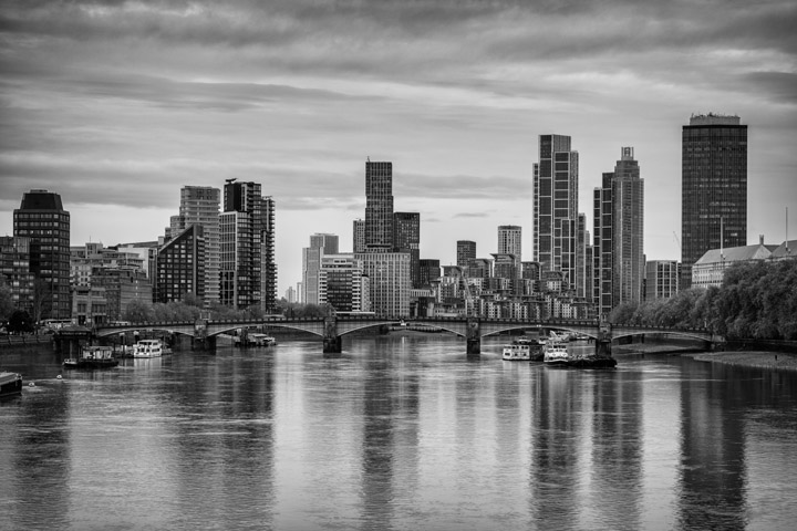 REF: WOF_R160_0059This purple toned panoramic photograph shows Albert Bridge at dawn . This print is available as an art print, canvas or acrylic panel in various different sizes. To see more photographs of this location or theme, or for help or advice please call 01992 939344.