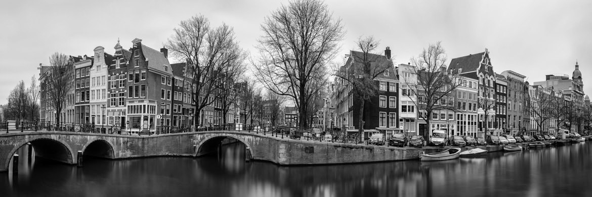 REF: WOF_W028_0051A photograph of Amsterdam Canal Panorama 1. This print is available as an art print, canvas or acrylic panel in various different sizes. To see more photographs of this location or theme, or for help or advice please call 01992 939344.