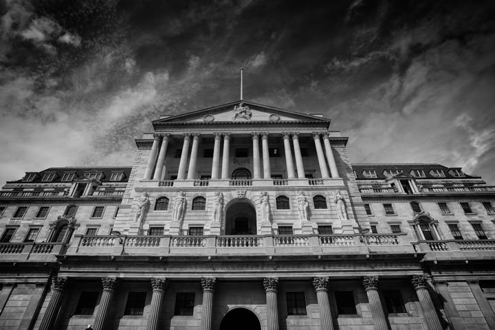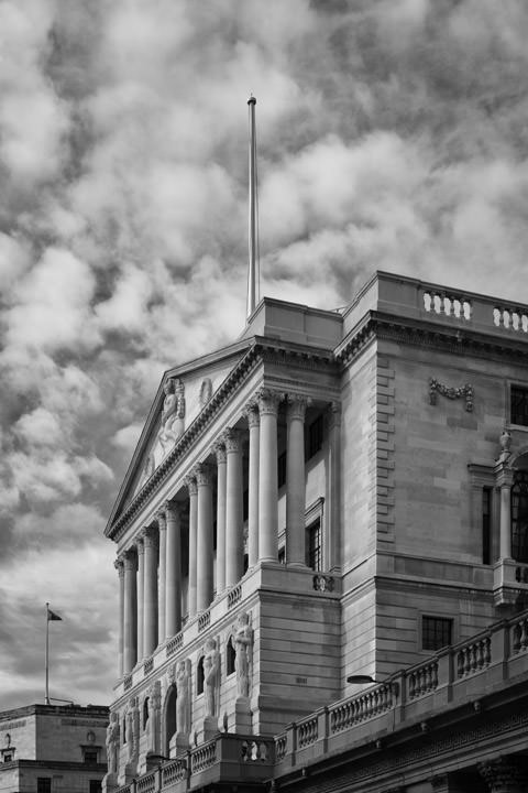 REF: WOF_X027_0099_1A black and white photograph of Bank of England from Threadneedle Street. This print is available as an art print, canvas or acrylic panel in various different sizes. To see more photographs of this location or theme, or for help or advice please call 01992 939344.