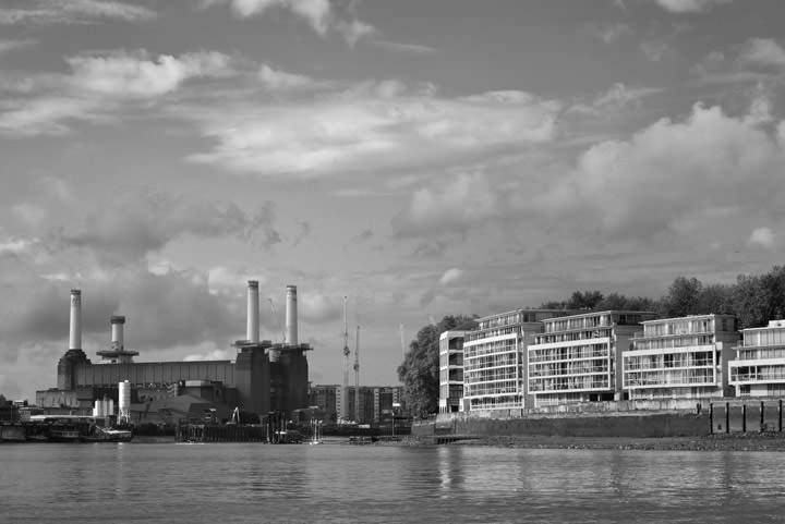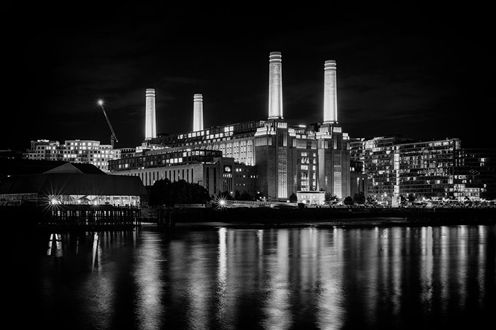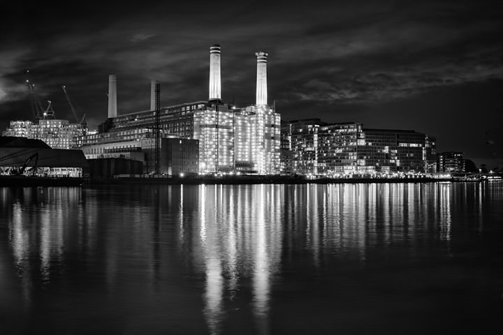 REF: WOF_Z118_0043PA photograph of Battersea Power Station Noir. This print is available as an art print, canvas or acrylic panel in various different sizes. To see more photographs of this location or theme, or for help or advice please call 01992 939344.