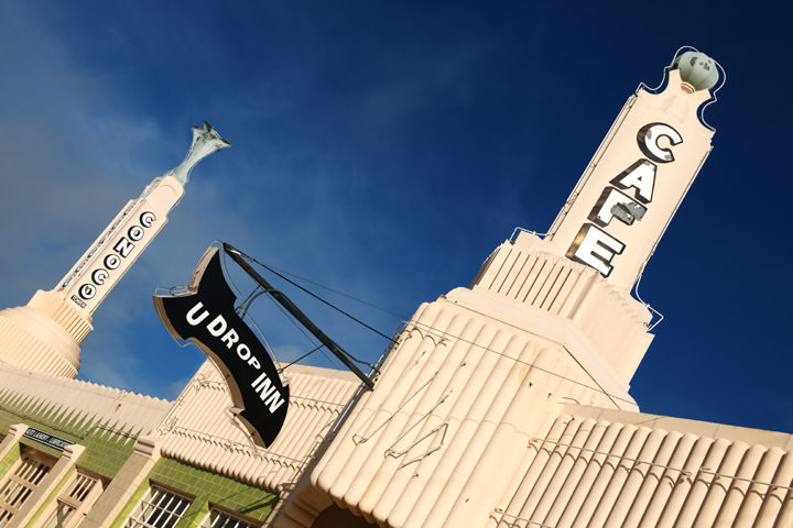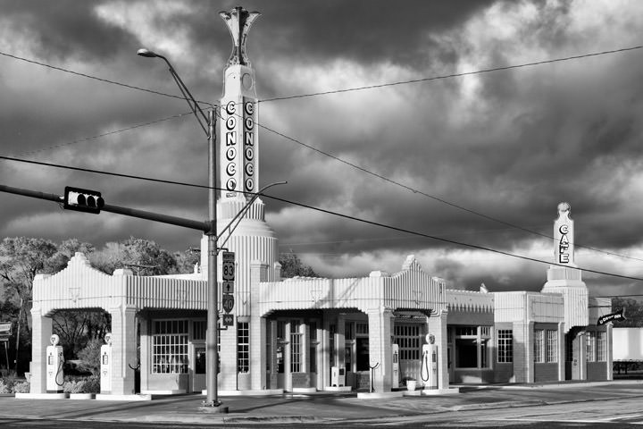 REF: WOF_K118_0125This photograph shows the towers at the Conoco gas station on Route 66 at Shamrock, Texas. This print is available as an art print, canvas or acrylic panel in various different sizes. To see more photographs of this location or theme, or for help or advice please call 01992 939344.
