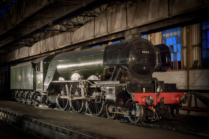 REF: WOF_T106_0162A photograph of Flying Scotsman inside the engine shed. This print is available as an art print, canvas or acrylic panel in various different sizes. To see more photographs of this location or theme, or for help or advice please call 01992 939344.