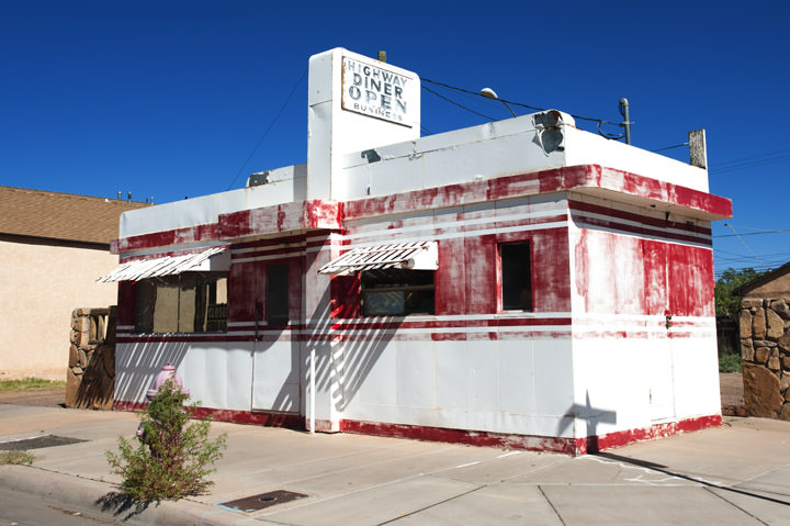 REF: WOF_K095_0108This black and white photograph shows the Galaxy Diner on Route 66 at Flagstaff, Arizona. This print is available as an art print, canvas or acrylic panel in various different sizes. To see more photographs of this location or theme, or for help or advice please call 01992 939344.