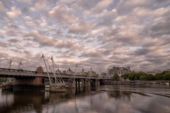 REF: WOF_M057_0335This photograph shows the Golden Jubilee and Hungerford Bridges beneath a beautiful sky on a lovely spring morning. This print is available as an art print, canvas or acrylic panel in various different sizes. To see more photographs of this location or theme, or for help or advice please call 01992 939344.