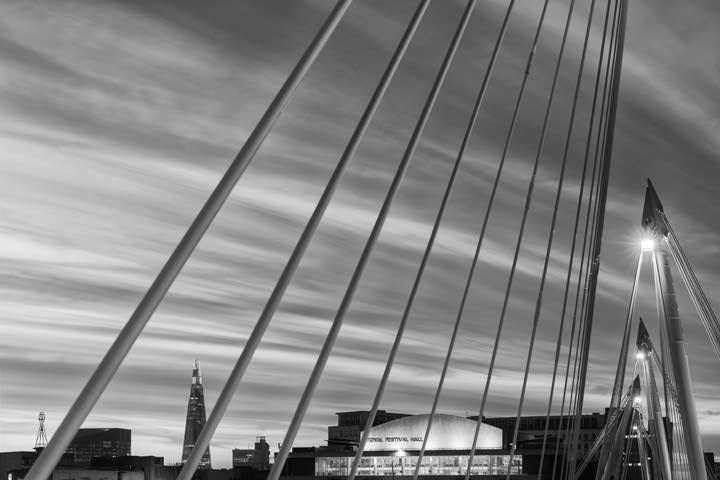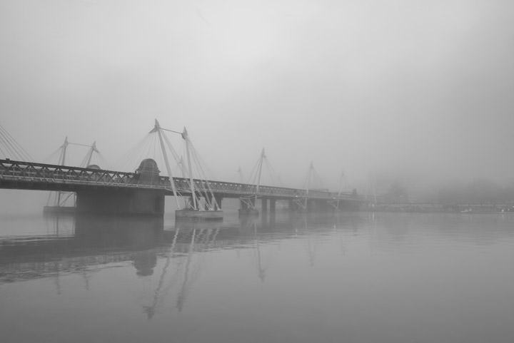 REF: WOF_M144_0139This black and white photograph shows the Jubilee Bridge disappearing into the morning mist. This print is available as an art print, canvas or acrylic panel in various different sizes. To see more photographs of this location or theme, or for help or advice please call 01992 939344.