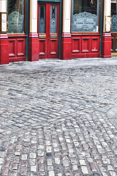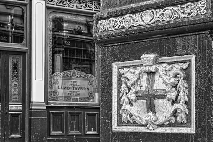 REF: WOF_L068_0120This black and white photograph shows Lamb Tavern at Leadenhall Market. This print is available as an art print, canvas or acrylic panel in various different sizes. To see more photographs of this location or theme, or for help or advice please call 01992 939344.