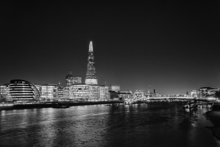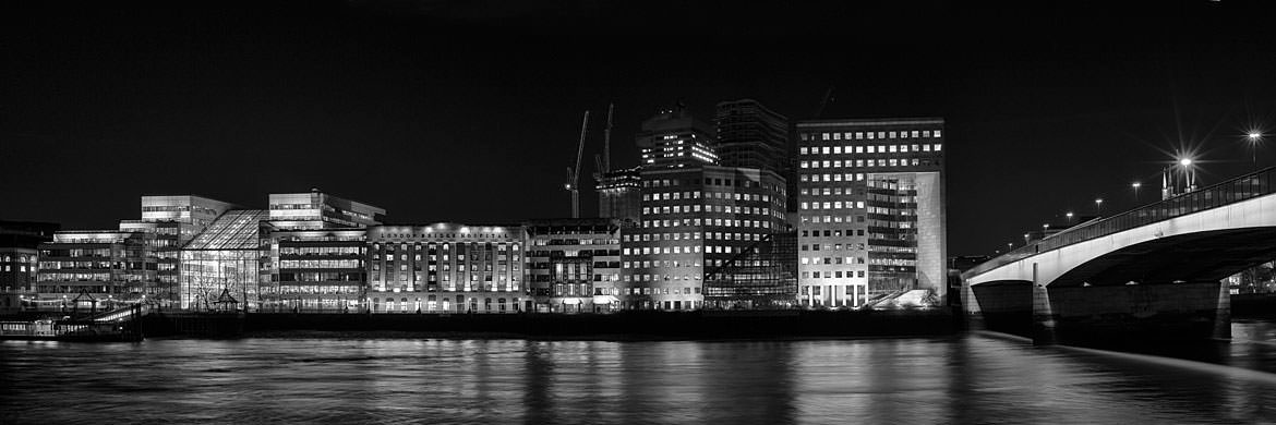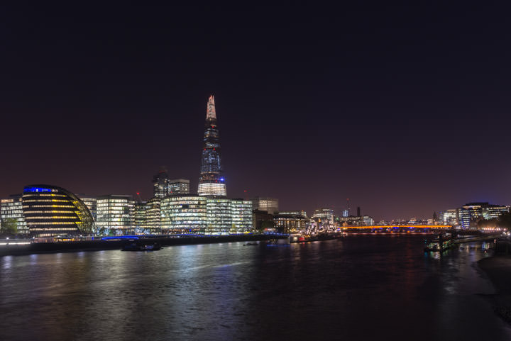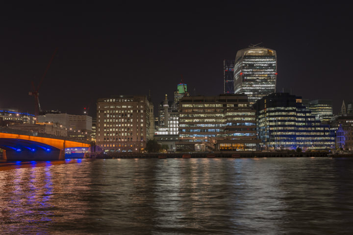 REF: WOF_M038_0068This photograph shows the orange light of London Bridge against a deep blue sky. This print is available as an art print, canvas or acrylic panel in various different sizes. To see more photographs of this location or theme, or for help or advice please call 01992 939344.