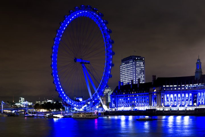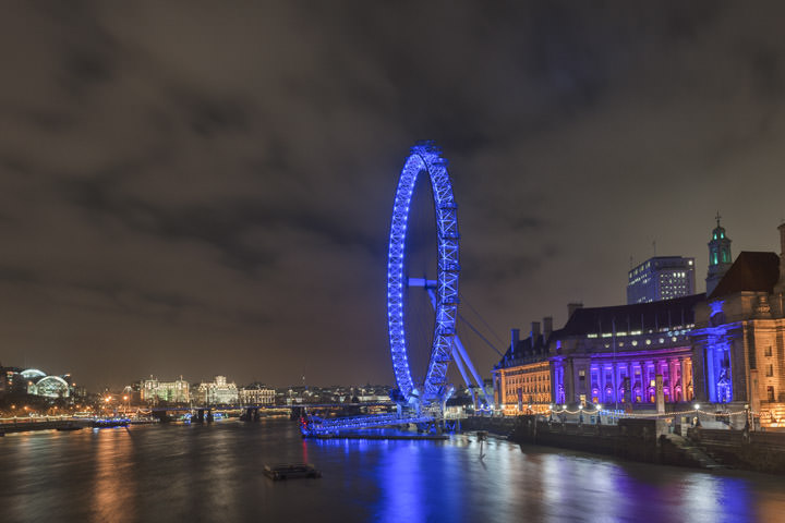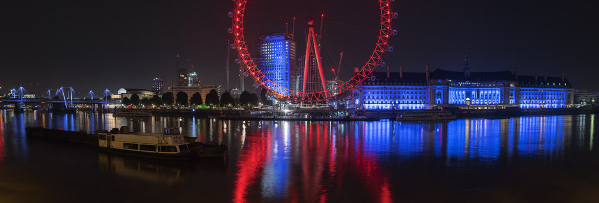 REF: WOF_L130_0160This photograph shows London Eye and County Hall both illuminated in blue. This print is available as an art print, canvas or acrylic panel in various different sizes. To see more photographs of this location or theme, or for help or advice please call 01992 939344.
