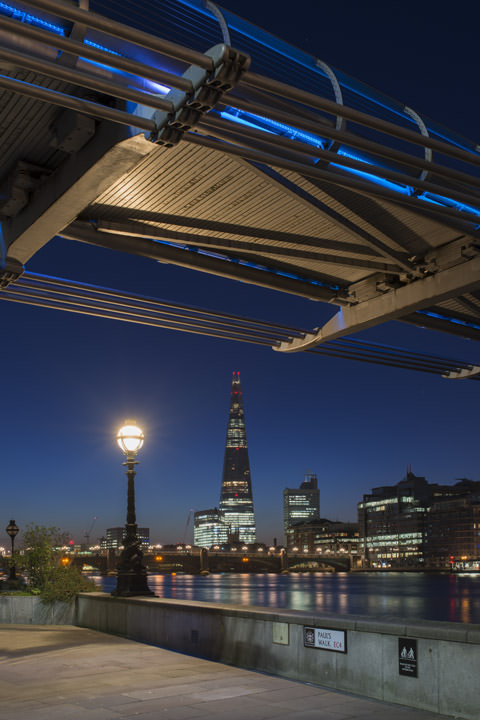 REF: WOF_N153_0010This photograph shows the Shard behind the Millennium Bridge at night. This print is available as an art print, canvas or acrylic panel in various different sizes. To see more photographs of this location or theme, or for help or advice please call 01992 535344.