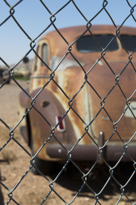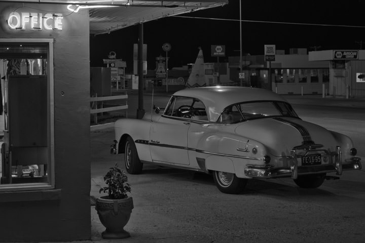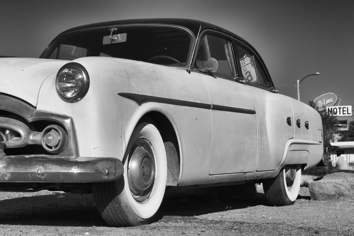 REF: WOF_K096_0022This black and white photograph shows a 1993 Packard on Route 66. This print is available as an art print, canvas or acrylic panel in various different sizes. To see more photographs of this location or theme, or for help or advice please call 01992 939344.