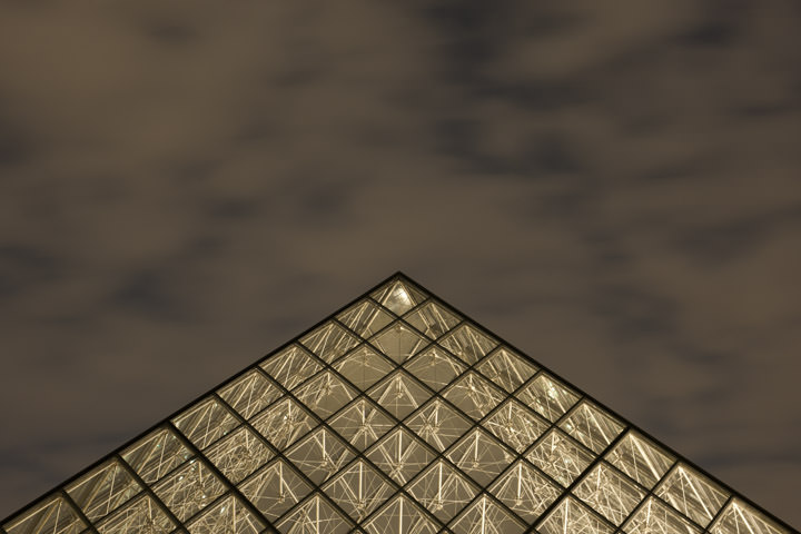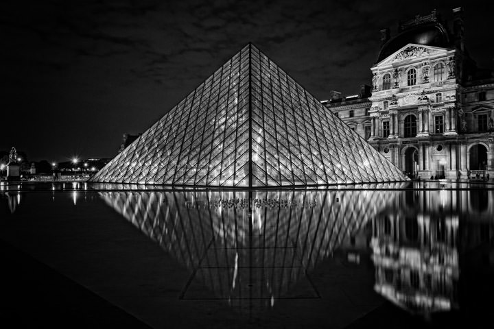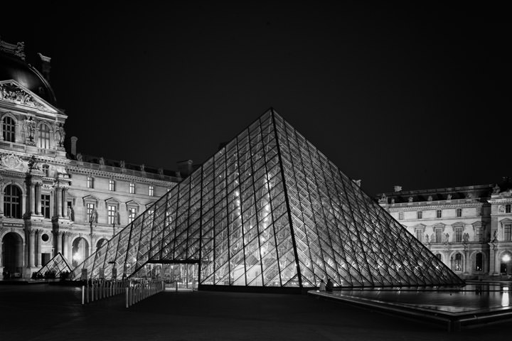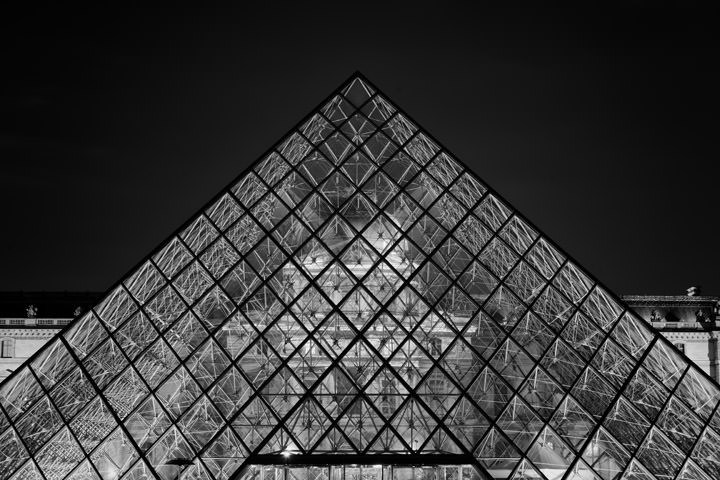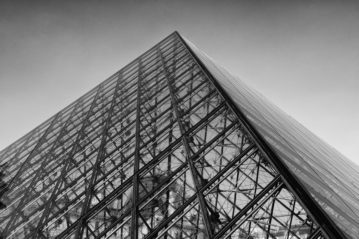 REF: WOF_K058_0072Showcase modern Paris with this striking black and white architectural photograph of the Louvre Pyramid, captured from a bold angle. The geometric composition adds a contemporary edge to any space.