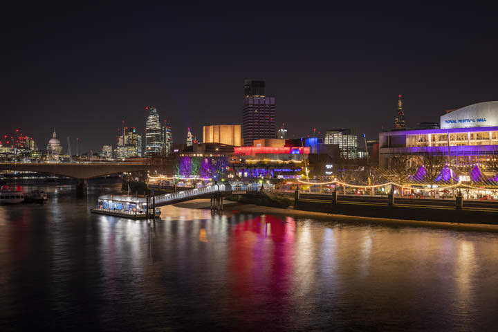 REF: WOF_L085_0060This panoramic photograph shows River Thames at Southwark at night. This print is available as an art print, canvas or acrylic panel in various different sizes. To see more photographs of this location or theme, or for help or advice please call 01992 939344.