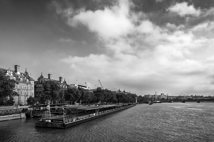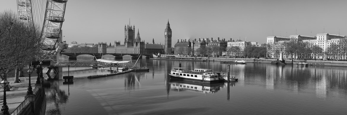 REF: WOF_J056_0360_1This black and white panoramic photograph shows River Thames at Westminster in the early morning. This print is available as an art print, canvas or acrylic panel in various different sizes. To see more photographs of this location or theme, or for help or advice please call 01992 939344.