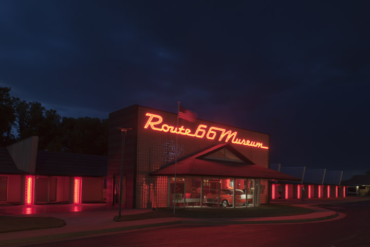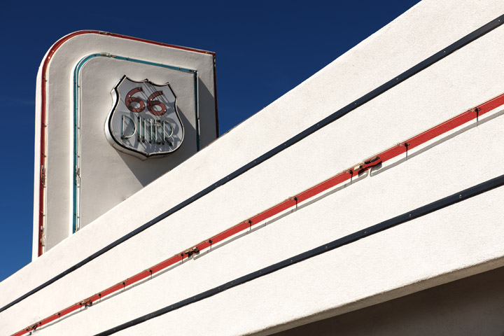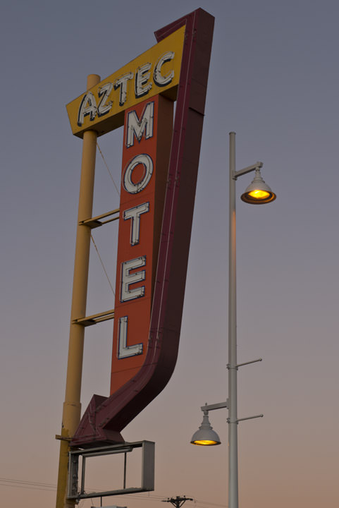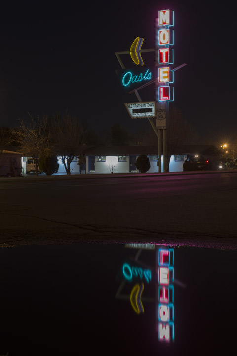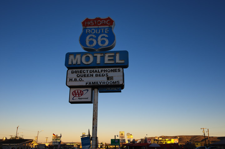 REF: WOF_J107_0023This photograph shows the neon sign of the Route 66 Motel in Seligman, Arizona at dusk. This print is available as an art print, canvas or acrylic panel in various different sizes. To see more photographs of this location or theme, or for help or advice please call 01992 939344.