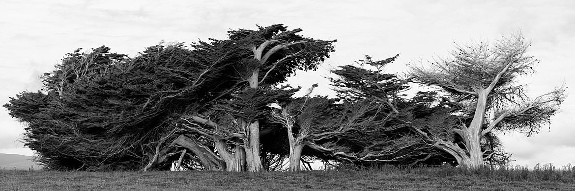 REF: WOF_J042_0039This black and white panoramic photograph shows trees in the Catlins in New Zealand. This print is available as an art print, canvas or acrylic panel in various different sizes. To see more photographs of this location or theme, or for help or advice please call 01992 939344.