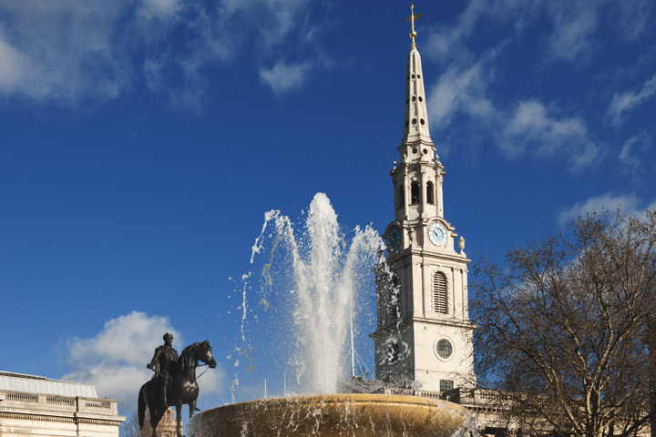 REF: WOF_L030_0278This photograph shows St Martins in the Fields and the Water Fountain at Trafalgar Square. This print is available as an art print, canvas or acrylic panel in various different sizes. To see more photographs of this location or theme, or for help or advice please call 01992 939344.