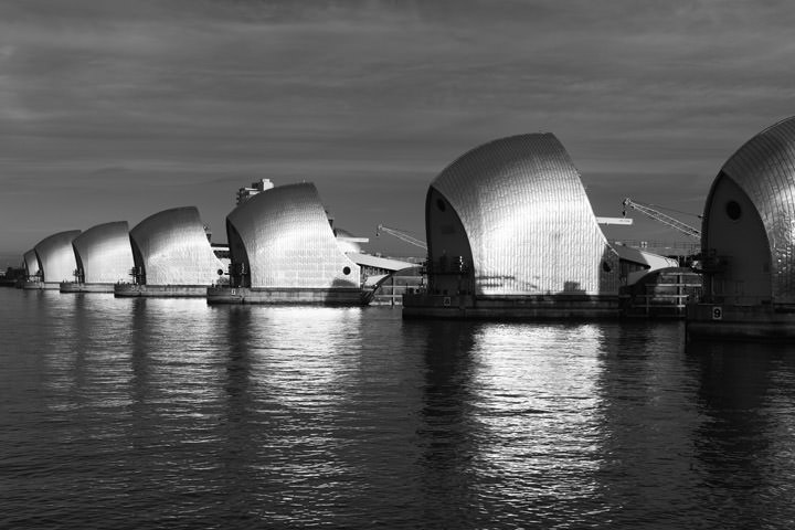 REF: WOF_H090_0185This black and white photograph shows the Thames Barrier and Canary Wharf from the River Thames. This print is available as an art print, canvas or acrylic panel in various different sizes. To see more photographs of this location or theme, or for help or advice please call 01992 939344.