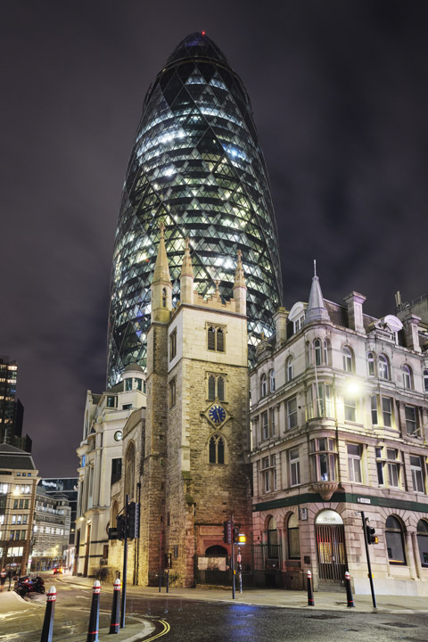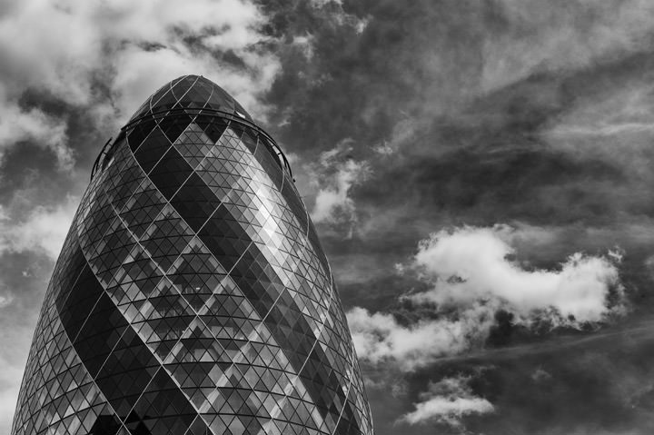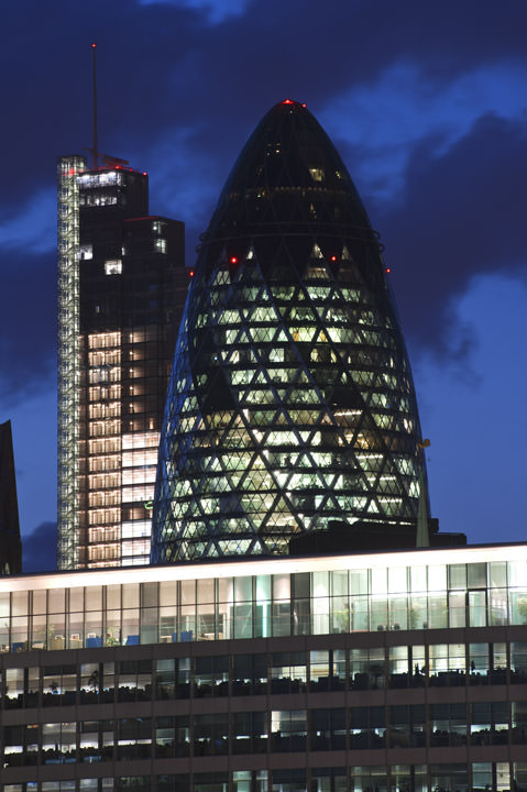 REF: WOF_K066_0085This photograph shows the Gherkin - 30 St Mary Axe - at night against a deep blue cloudy sky. This print is available as an art print, canvas or acrylic panel in various different sizes. To see more photographs of this location or theme, or for help or advice please call 01992 939344.