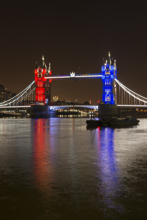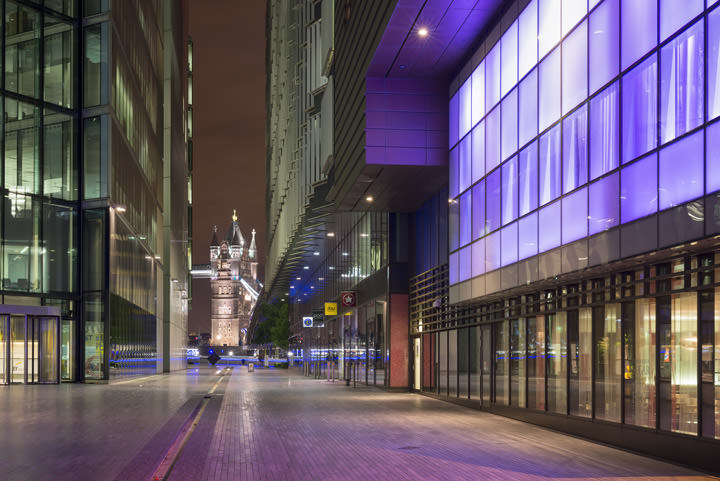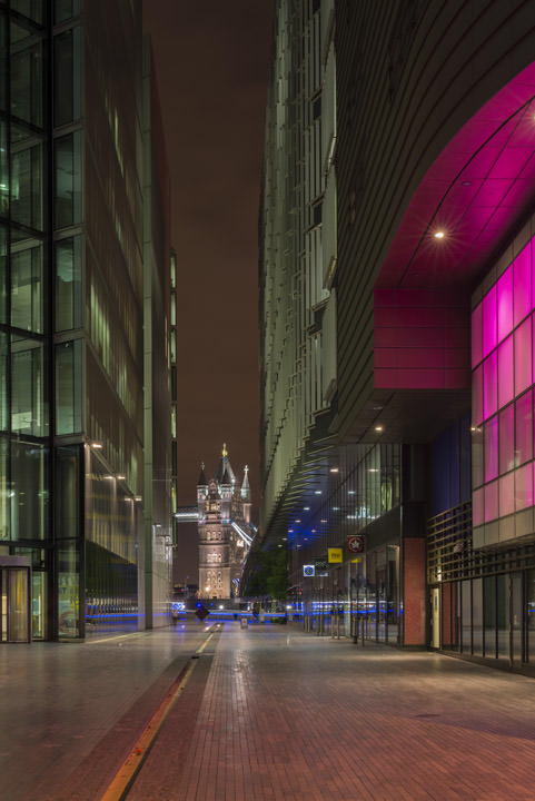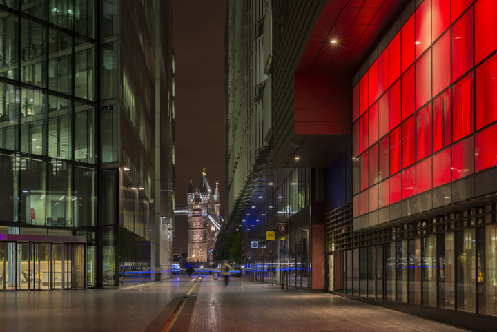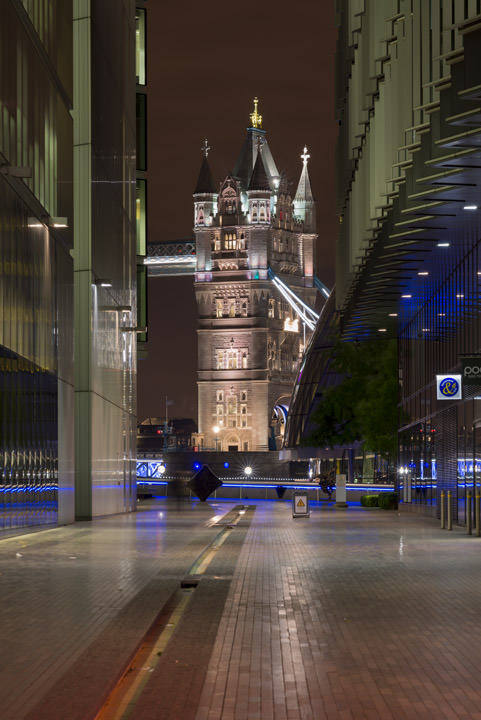 REF: WOF_N085_0299This photograph shows Tower Bridge seen trough brightly lit modern offices. This print is available as an art print, canvas or acrylic panel in various different sizes. To see more photographs of this location or theme, or for help or advice please call 01992 939344.