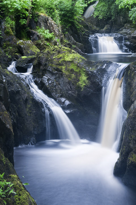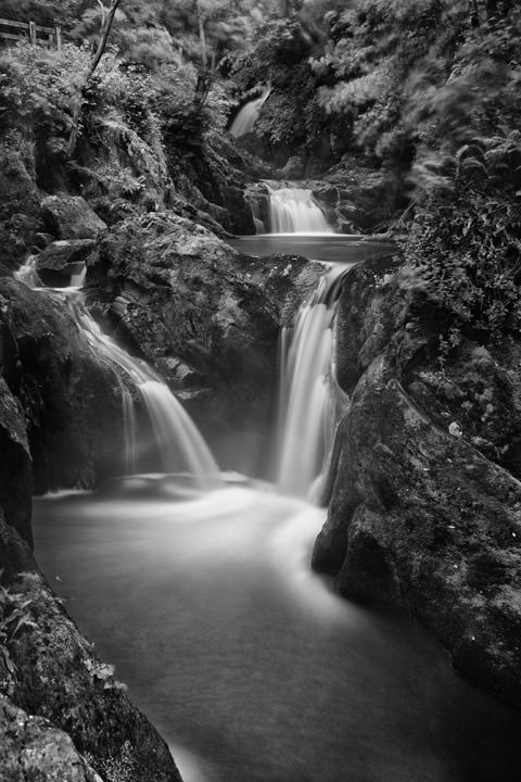 REF: WOF_L064_0023This black and white photograph shows Triple Spout Falls in Ingelton in the Yorkshire Dales in England. This print is available as an art print, canvas or acrylic panel in various different sizes. To see more photographs of this location or theme, or for help or advice please call 01992 939344.