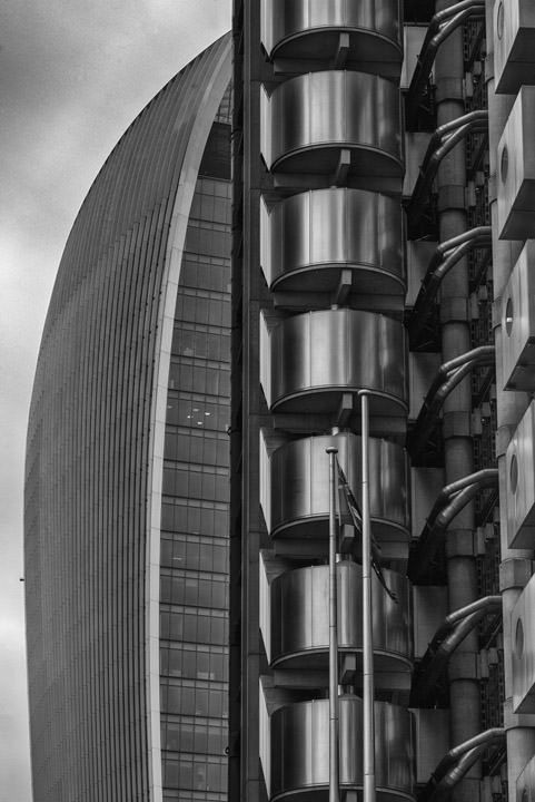 REF: WOF_P095_0124This photograph shows architectural detail of the Lloyds and Walkie Talkie Buildings. This print is available as an art print, canvas or acrylic panel in various different sizes. To see more photographs of this location or theme, or for help or advice please call 01992 939344.