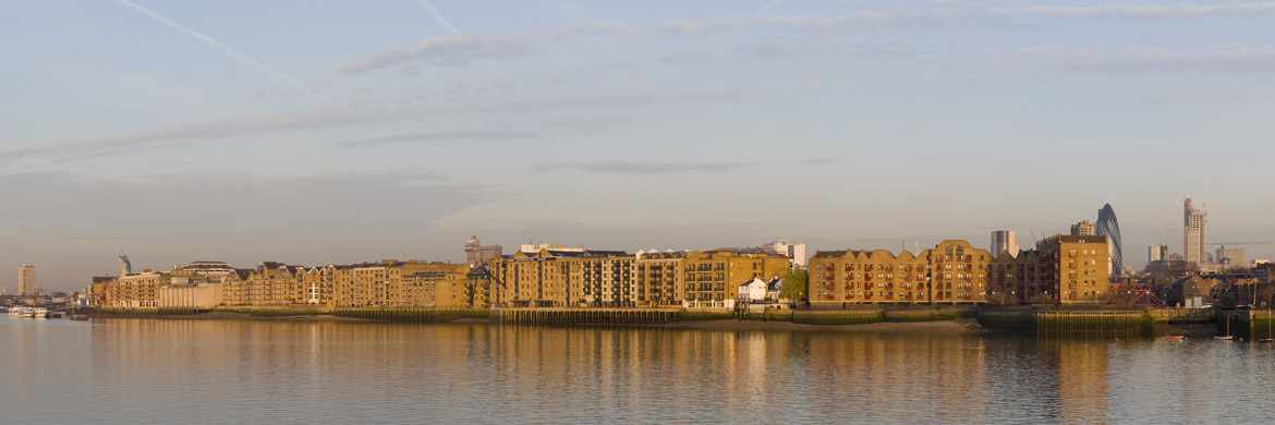 REF: WOF_J049_0373_1This black and white panoramic photograph shows Wapping and Limehouse in soft early morning light. This print is available as an art print, canvas or acrylic panel in various different sizes. To see more photographs of this location or theme, or for help or advice please call 01992 939344.