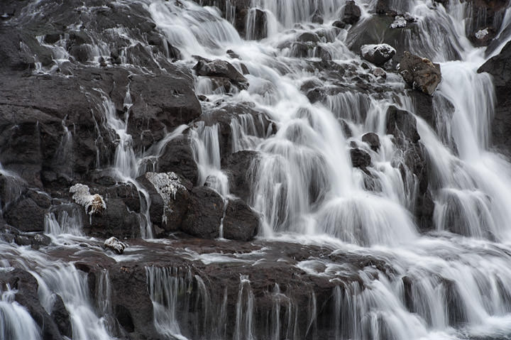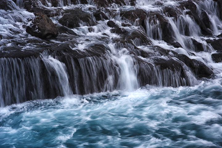 REF: WOF_L042_0178This photograph shows cascading waterfalls in Hraunfossar in Iceland. This print is available as an art print, canvas or acrylic panel in various different sizes. To see more photographs of this location or theme, or for help or advice please call 01992 939344.