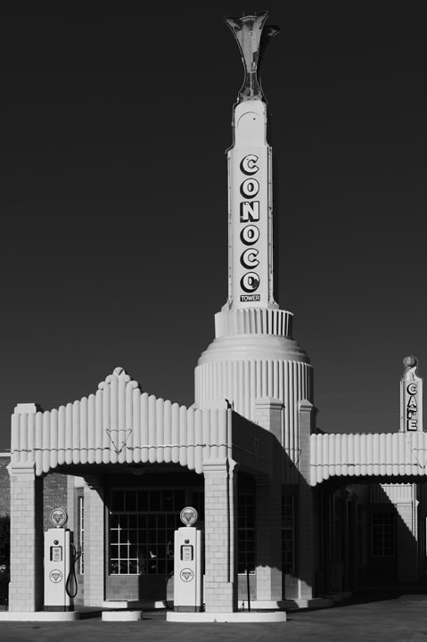 REF: WOF_K088_0375This black and white photograph shows Whitings Gas Station on Route 66 at Tucumcari in New Mexico. This print is available as an art print, canvas or acrylic panel in various different sizes. To see more photographs of this location or theme, or for help or advice please call 01992 939344.