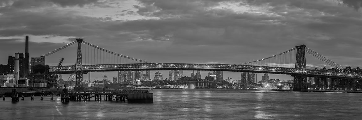 REF: WOF_M004_0246This panoramic photograph shows the pink skies of early evening as the sun sets at the Williamsburg Bridge. This print is available as an art print, canvas or acrylic panel in various different sizes. To see more photographs of this location or theme, or for help or advice please call 01992 939344.